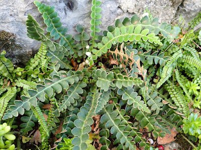 Hoja de Doradilla en el centro y de Asplenium trichomanes a la derecha y abajo.